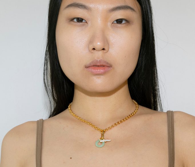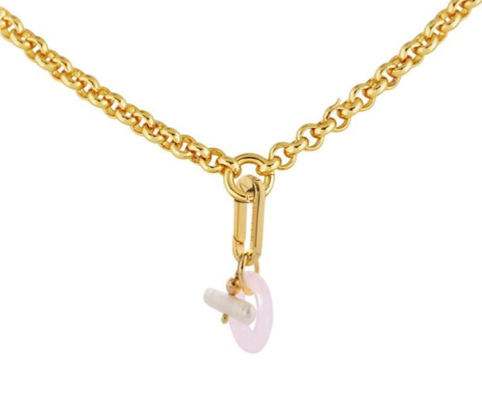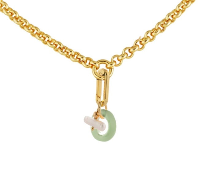 Thanks to our 18K gold plated carabiner detail, you can seamlessly clip the glass Toggle and Pearl T-Bar on and off your necklace like charms, allowing you to wear our belcher chain with just the Pearl T-Bar or with a pop of glass colour.