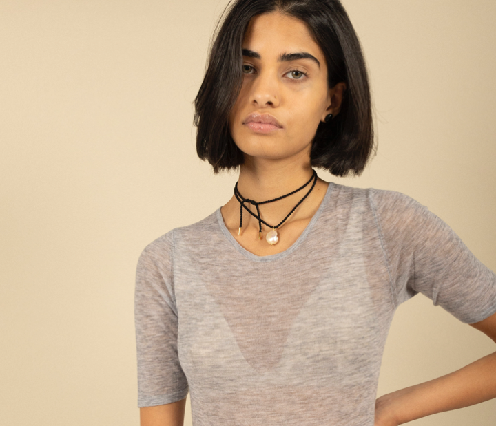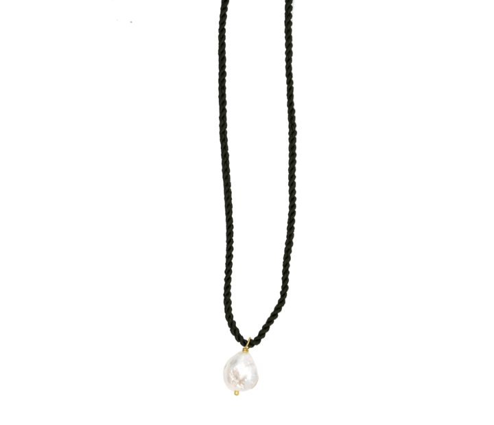 Adjustable cord length with tie knot fastening. Total cord length 80cm. You can wear it long, short or even as choker.