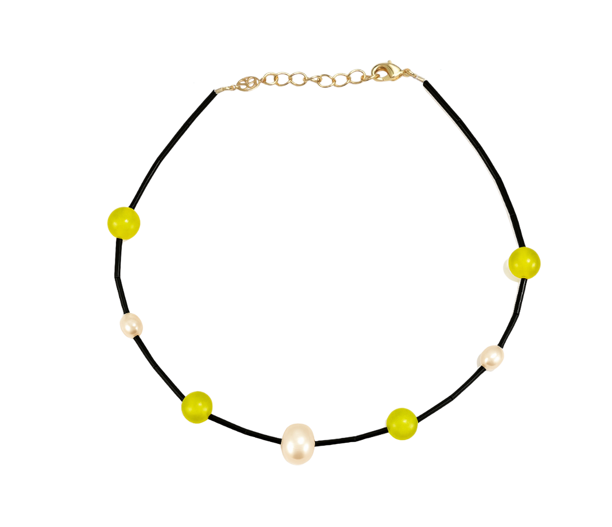 Black glass tubes with alternating citrine cat eye and pearl beads. 18K gold plated clasp and extension chain.