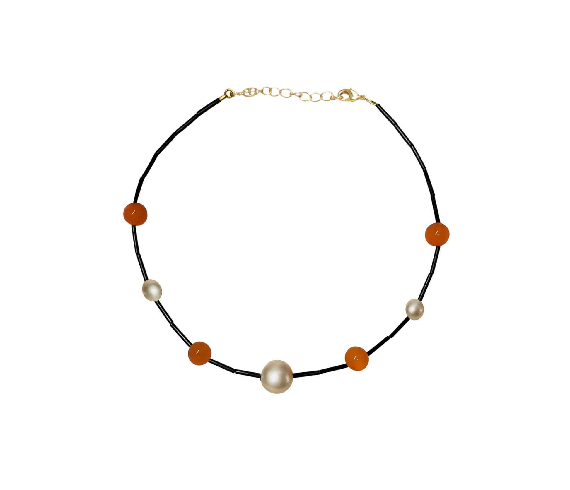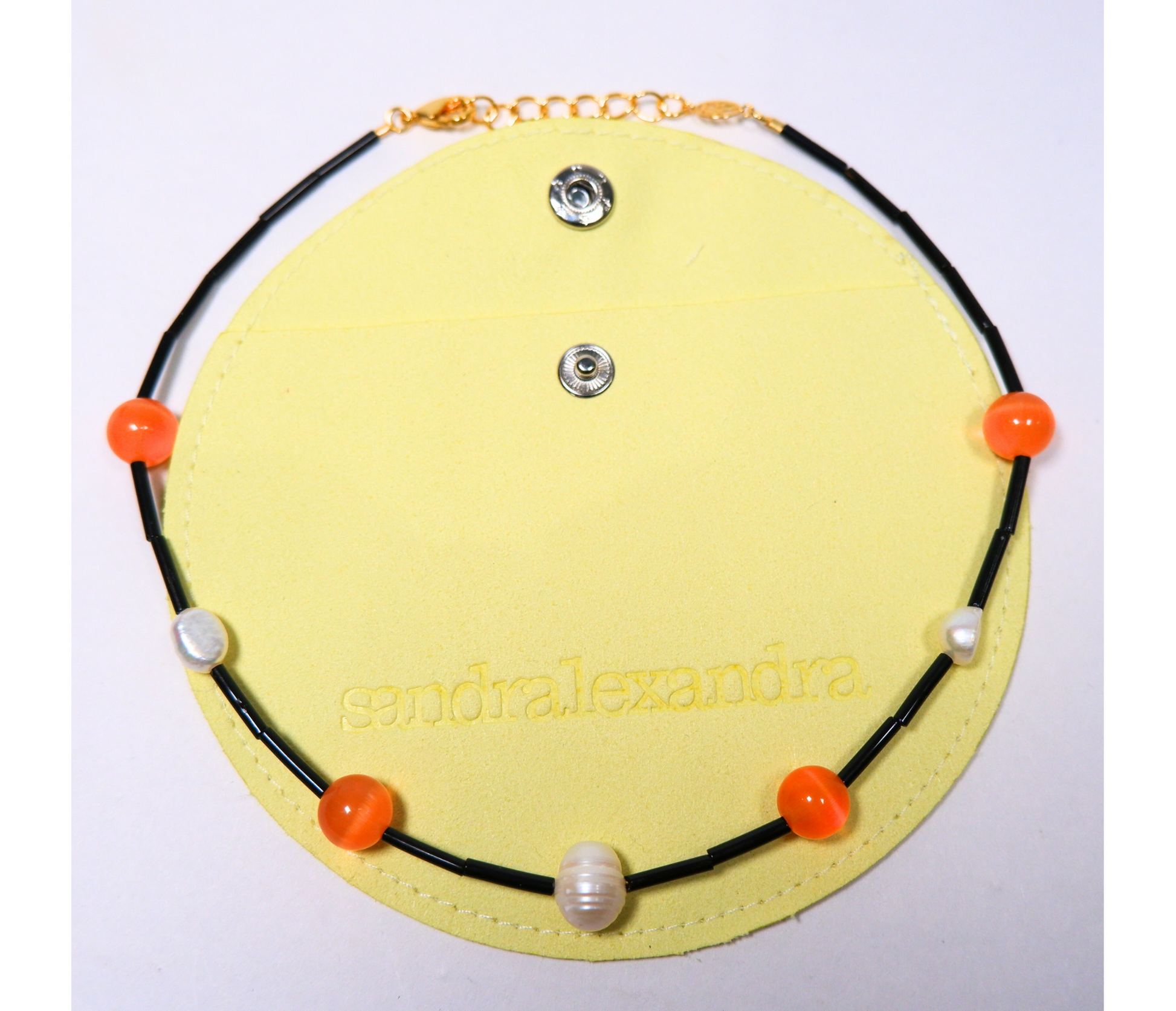 Black glass tubes with alternating orange cat eye and pearl beads. 18K gold plated clasp and extension chain.
