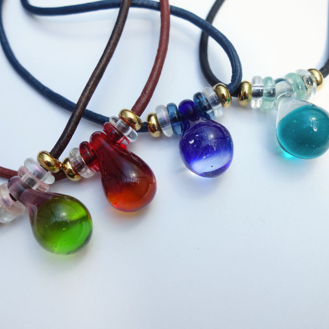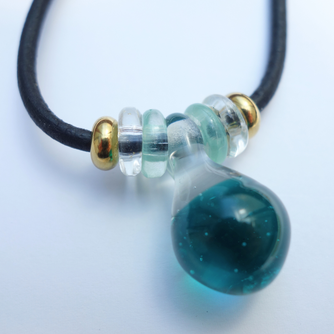 Handworked Murano aquamarine and clear glass Buoy charm nestled between soda lime glass rondelles. The beads are suspended on genuine black leather cord.