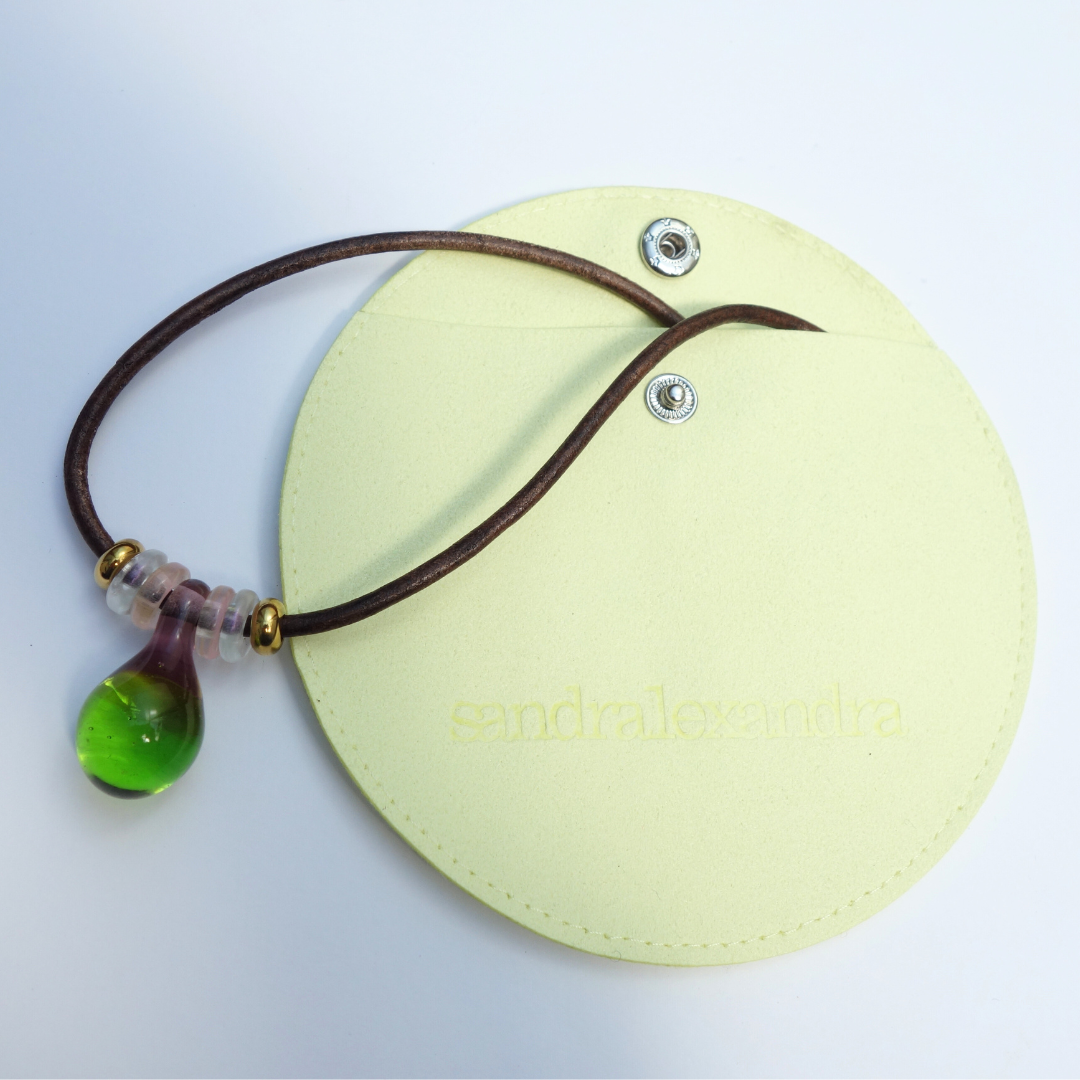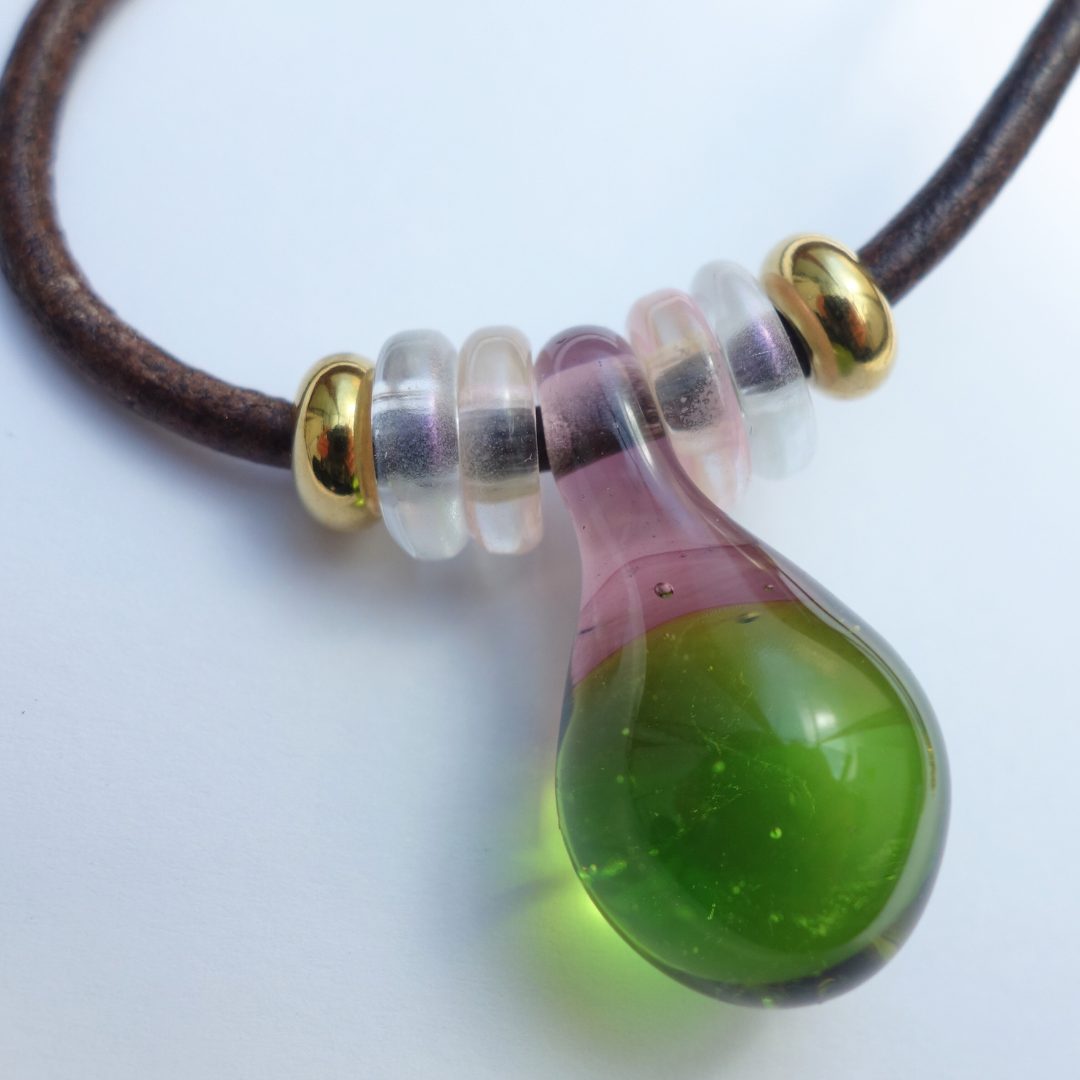 Handworked Murano green and lavender glass Buoy charm nestled between soda lime glass rondelles. The beads are suspended on genuine vintage brown leather cord.