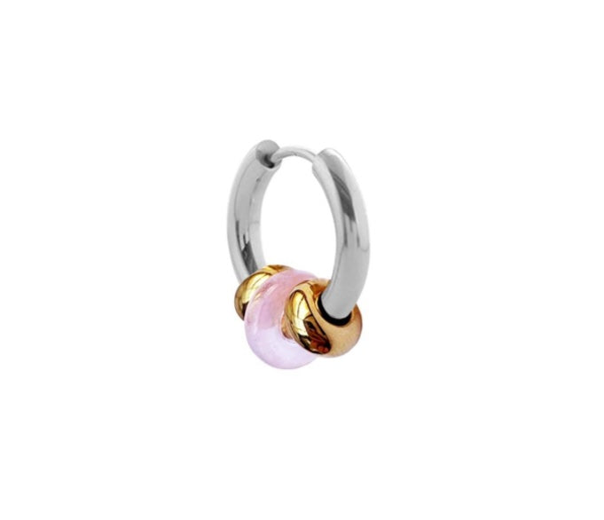 Pink glass rondelles made from soda glass suspended on 18K gold plated nickel free or imitation rhodium plated hoops. Light-catching and versatile, the sleek gold and silver colourways can be mixed or matched.