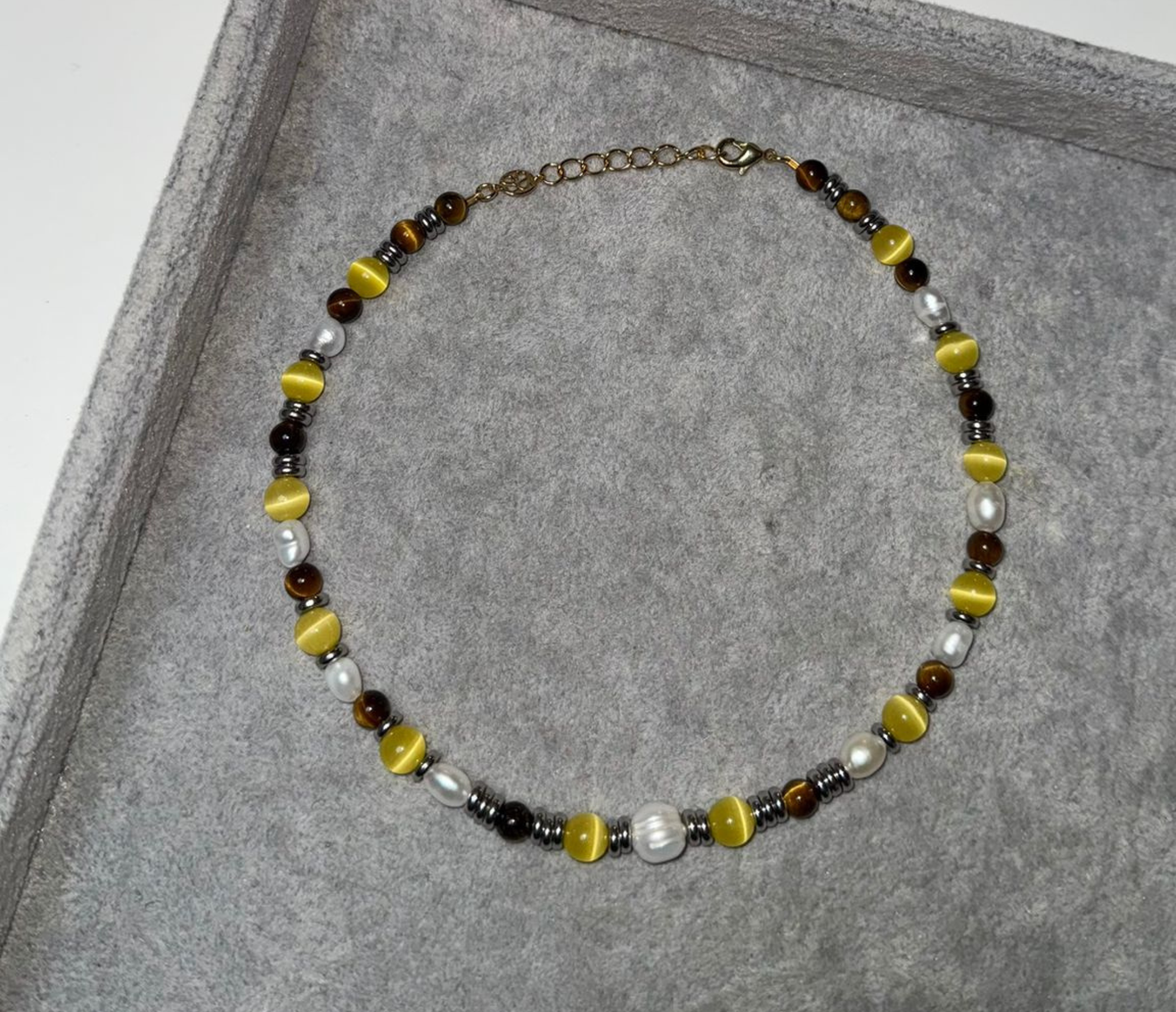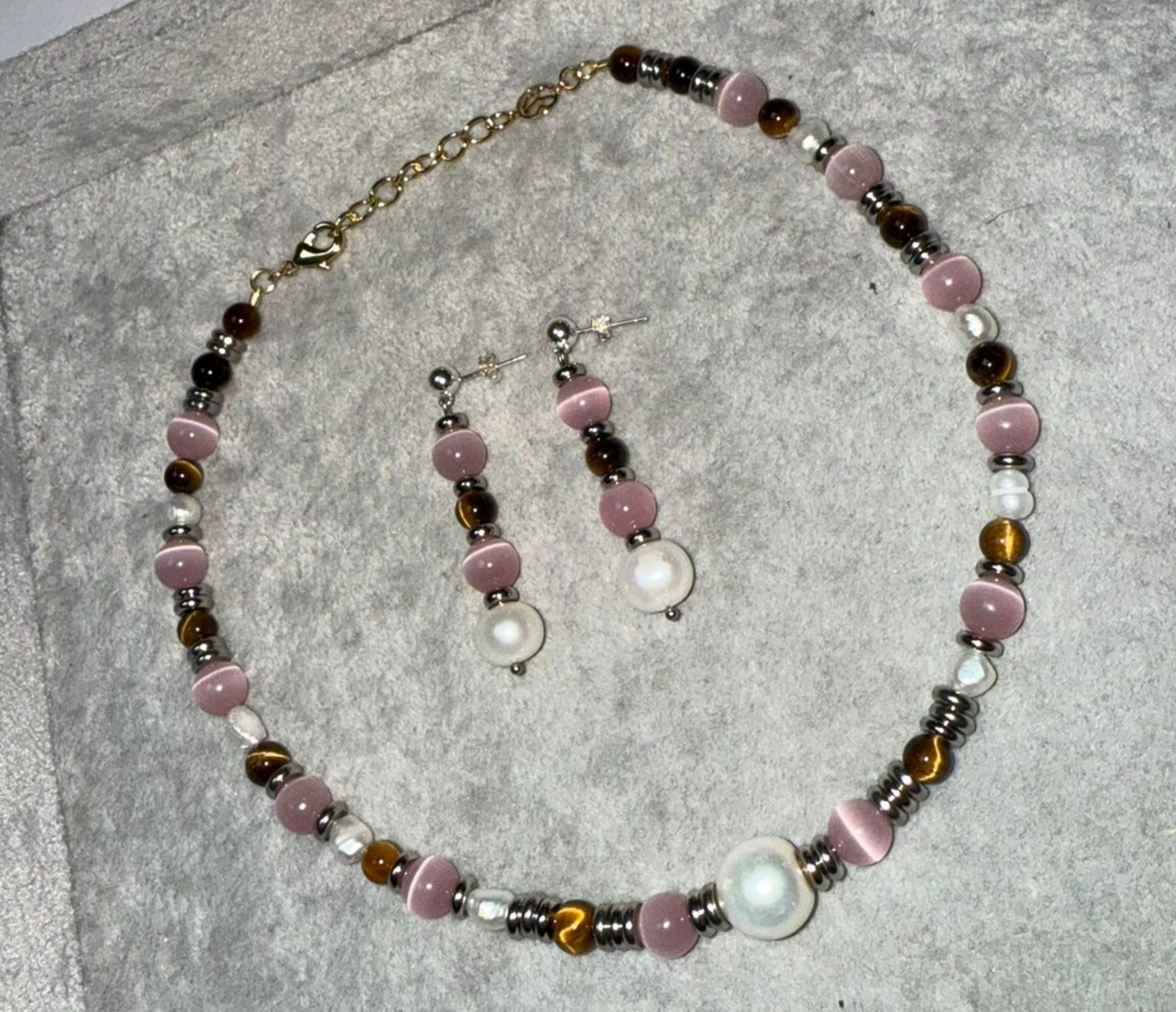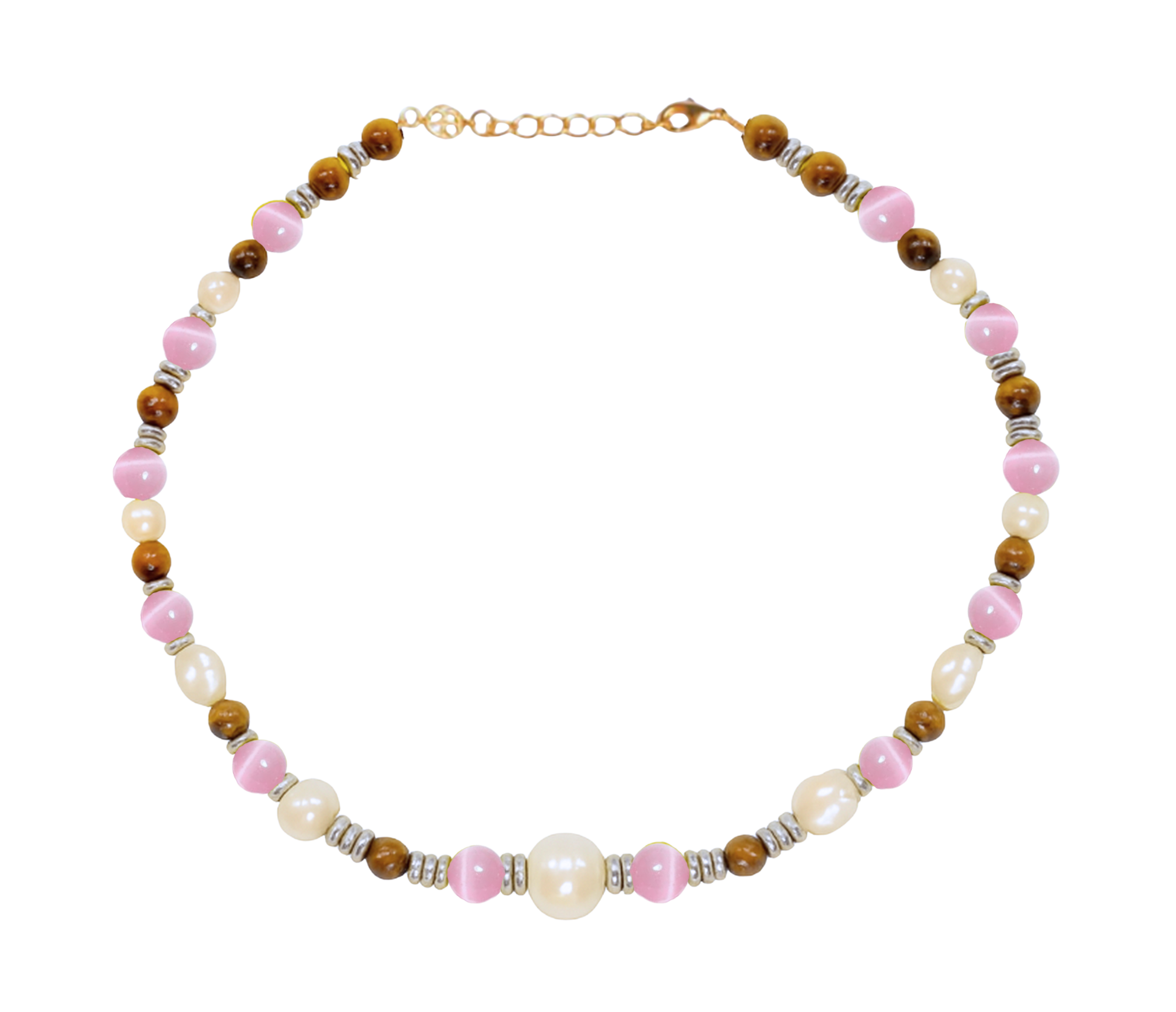 Alternating pink cat eye, tigers eye, pearl and silver rondelle beads finished with a central potato pearl. 18K gold plated clasp and extension chain.