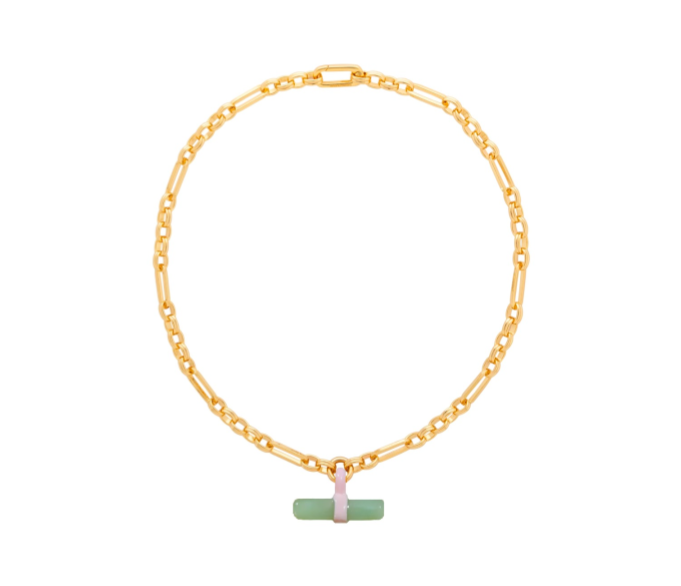 Lampwork glass T-bar in pink and mint handmade by local artisans between Barcelona and the UK. Finished with 18-Karat gold plated brass mixed link chain.