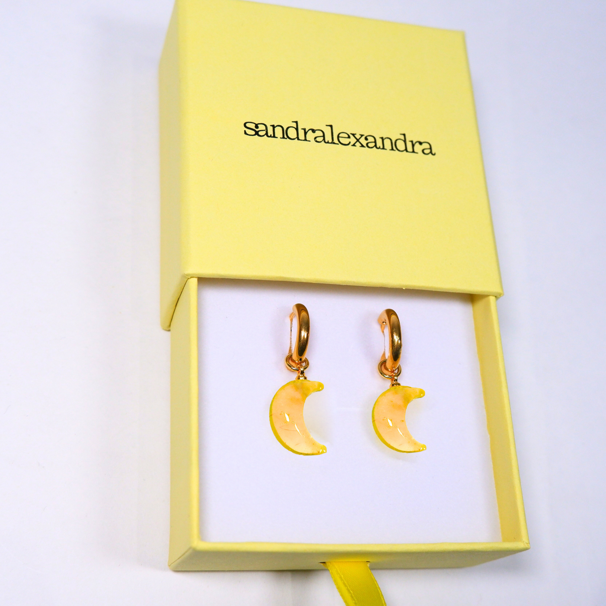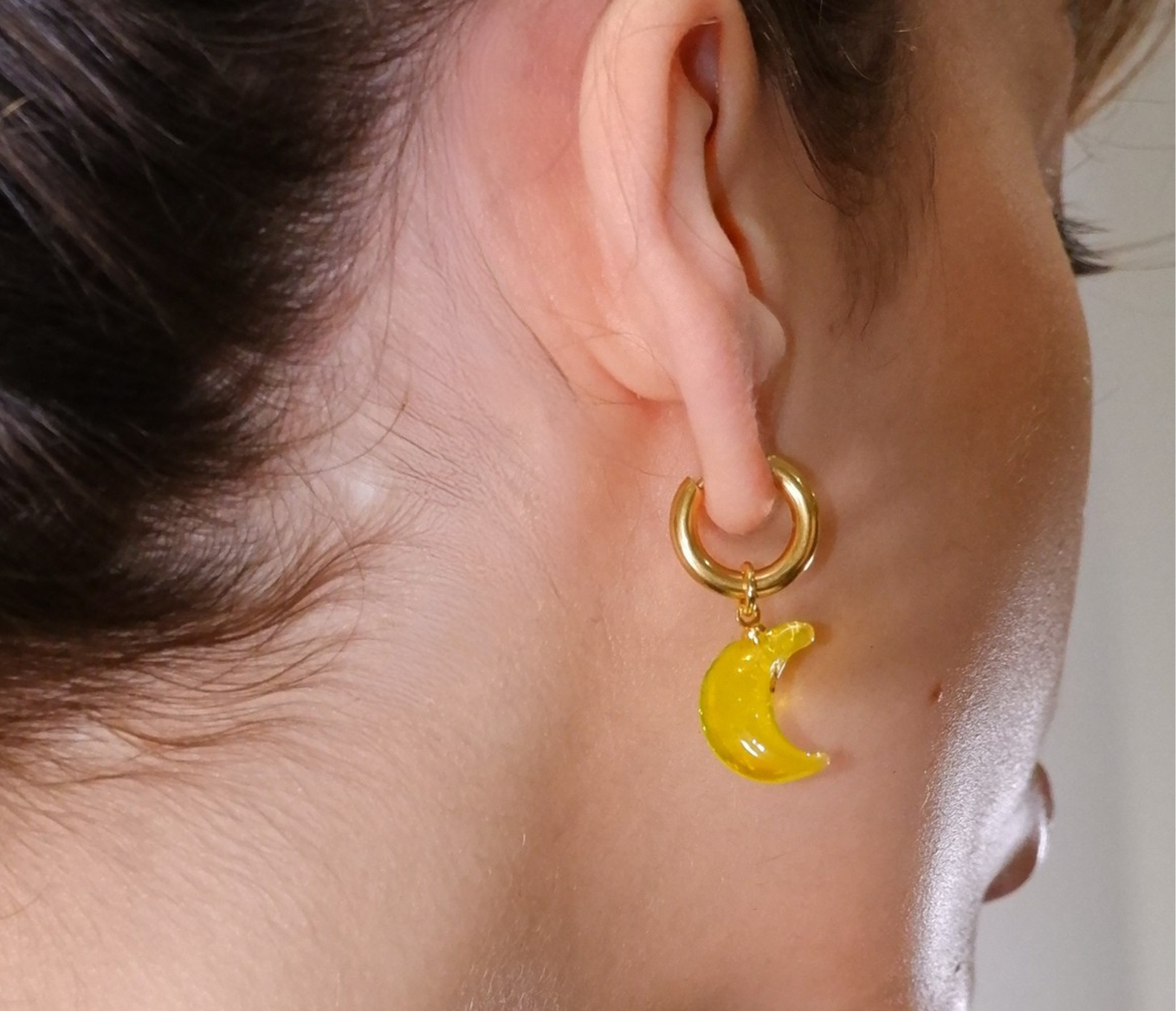 Handcrafted Murano lemon colour glass moon, suspended to a 18K gold plated nickel free hoop earring.