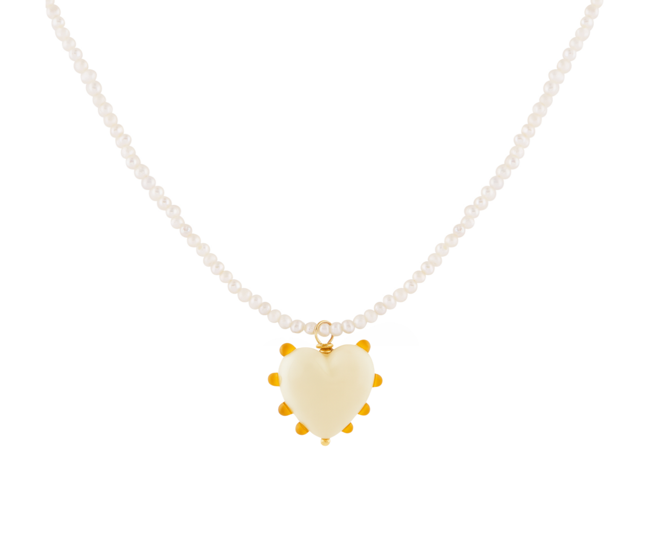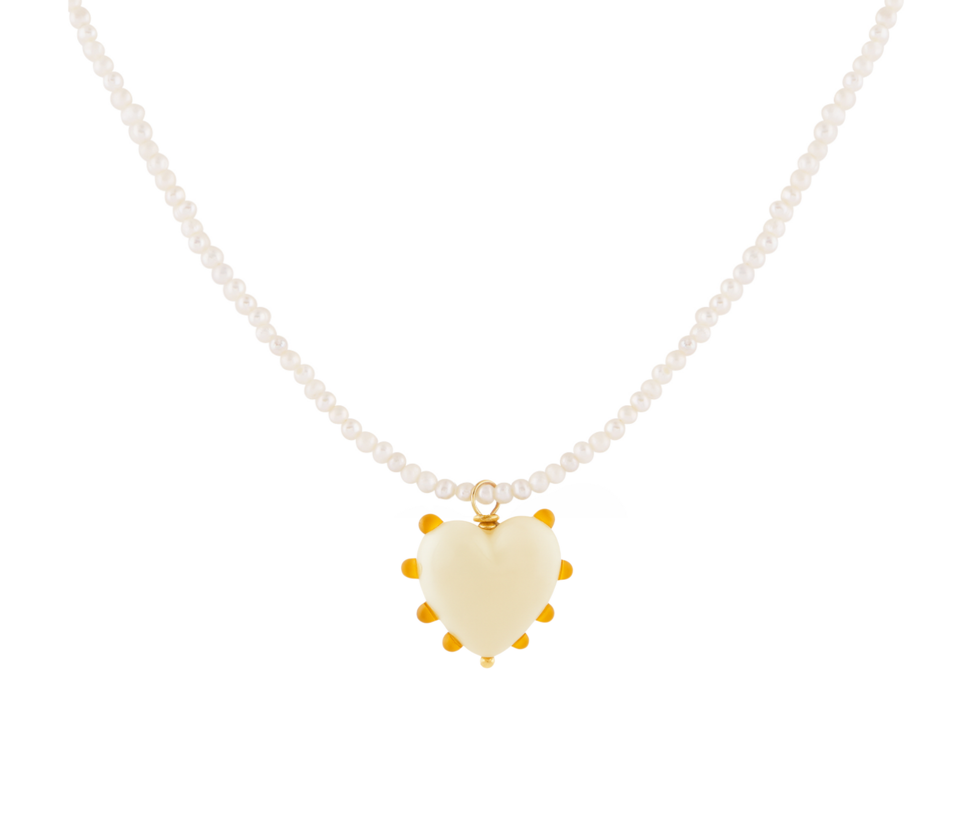 Lampwork glass hearts handmade by local artisans between Barcelona and the UK paired with freshwater pearl chain necklace.