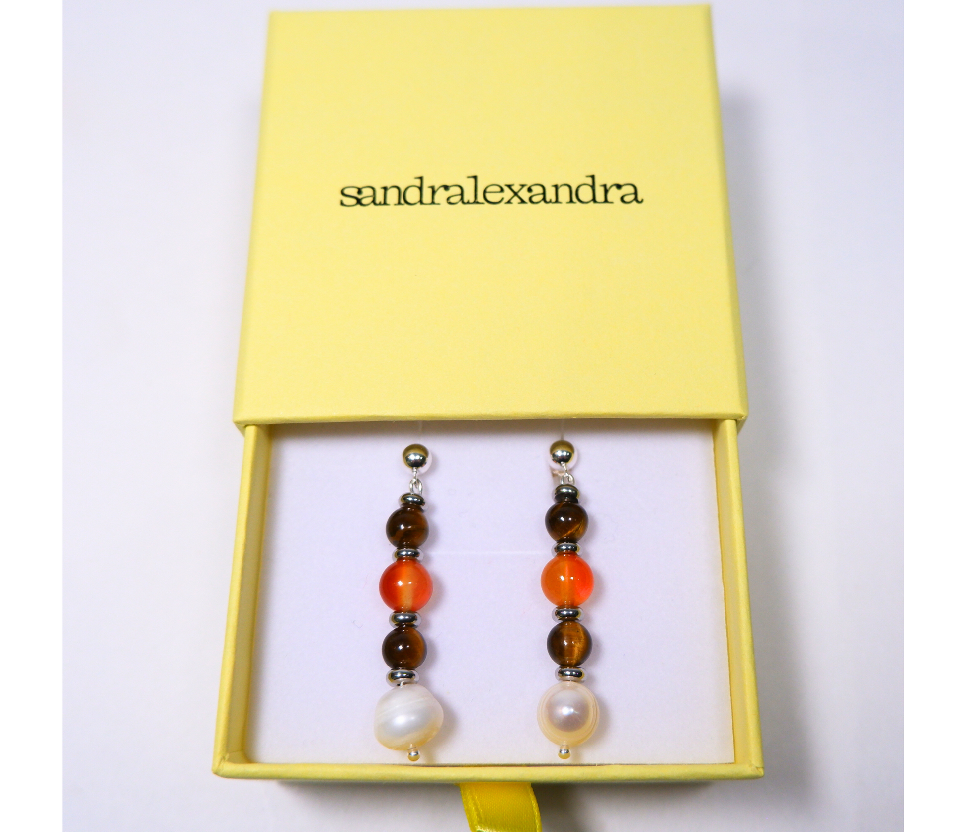 Orange cat eye, tigers eye, pearl and silver drop earrings. Silver 295 ball stud and back fastening.