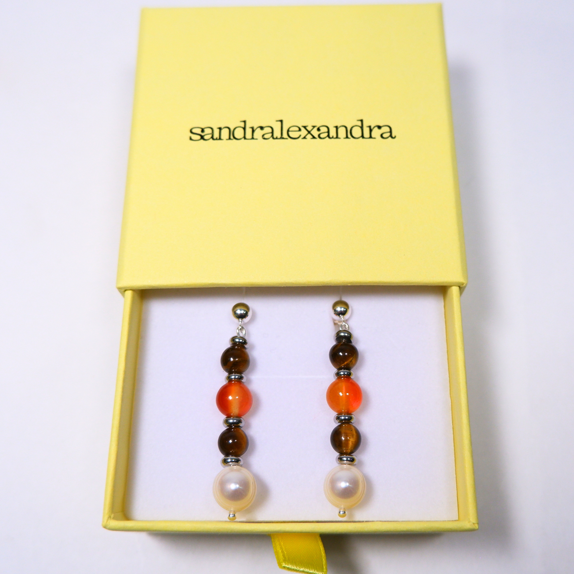 Orange cat eye, tigers eye, pearl and silver drop earrings. Silver 295 ball stud and back fastening.