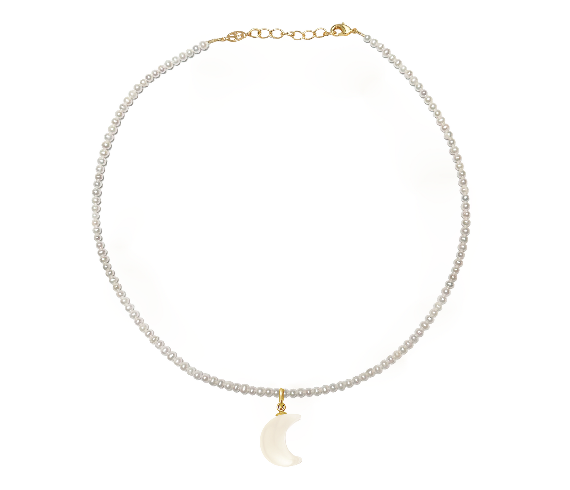 Handcrafted Murano pearl glass moon suspended to a freshwater pearl chain. 18K gold clasp and extension chain.