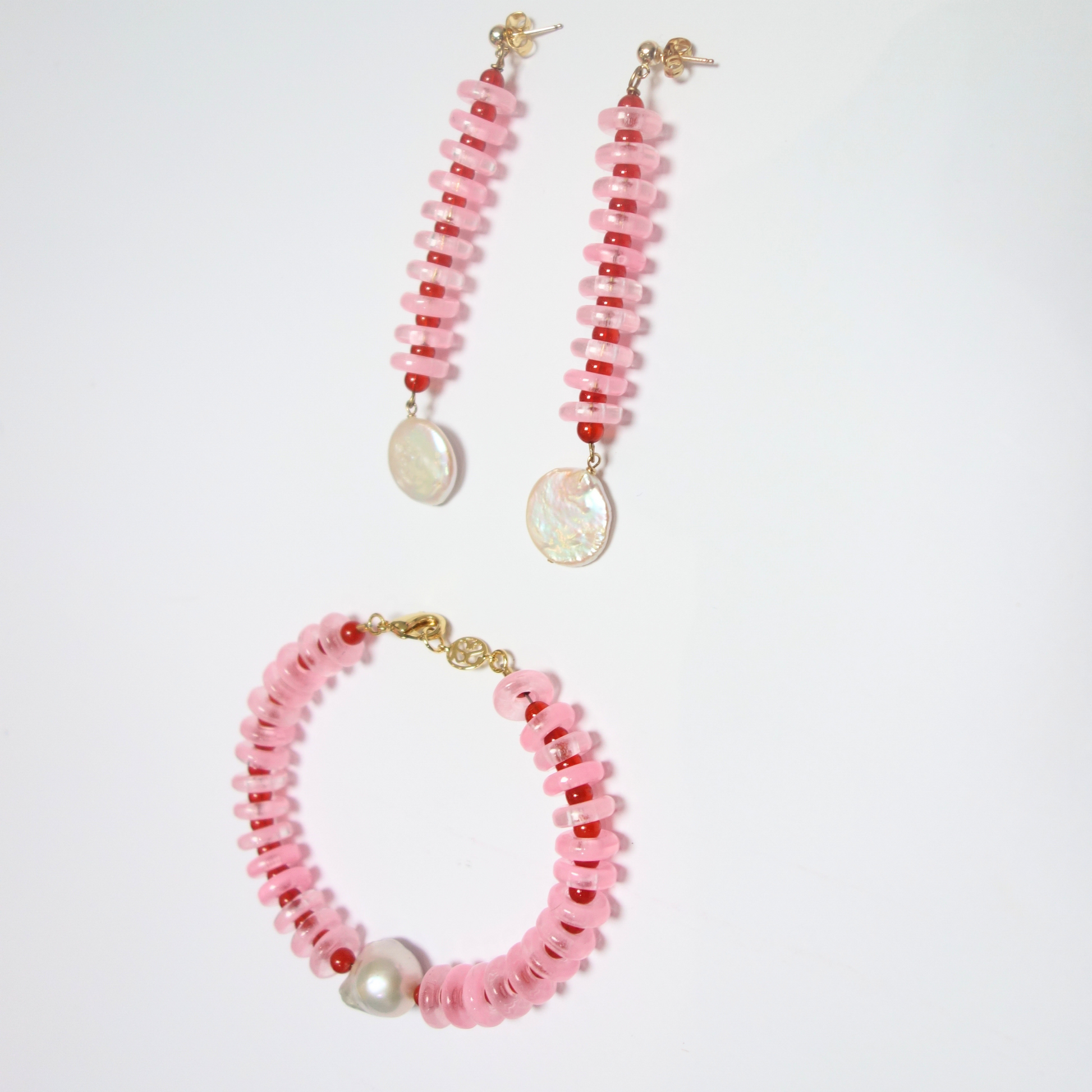 Alternating pink glass rondelles and red agate semi precious stones create a rhythmic wave pattern that is finished with a distinctive keshi pearl. Finished with 14K gold filled earring findings.