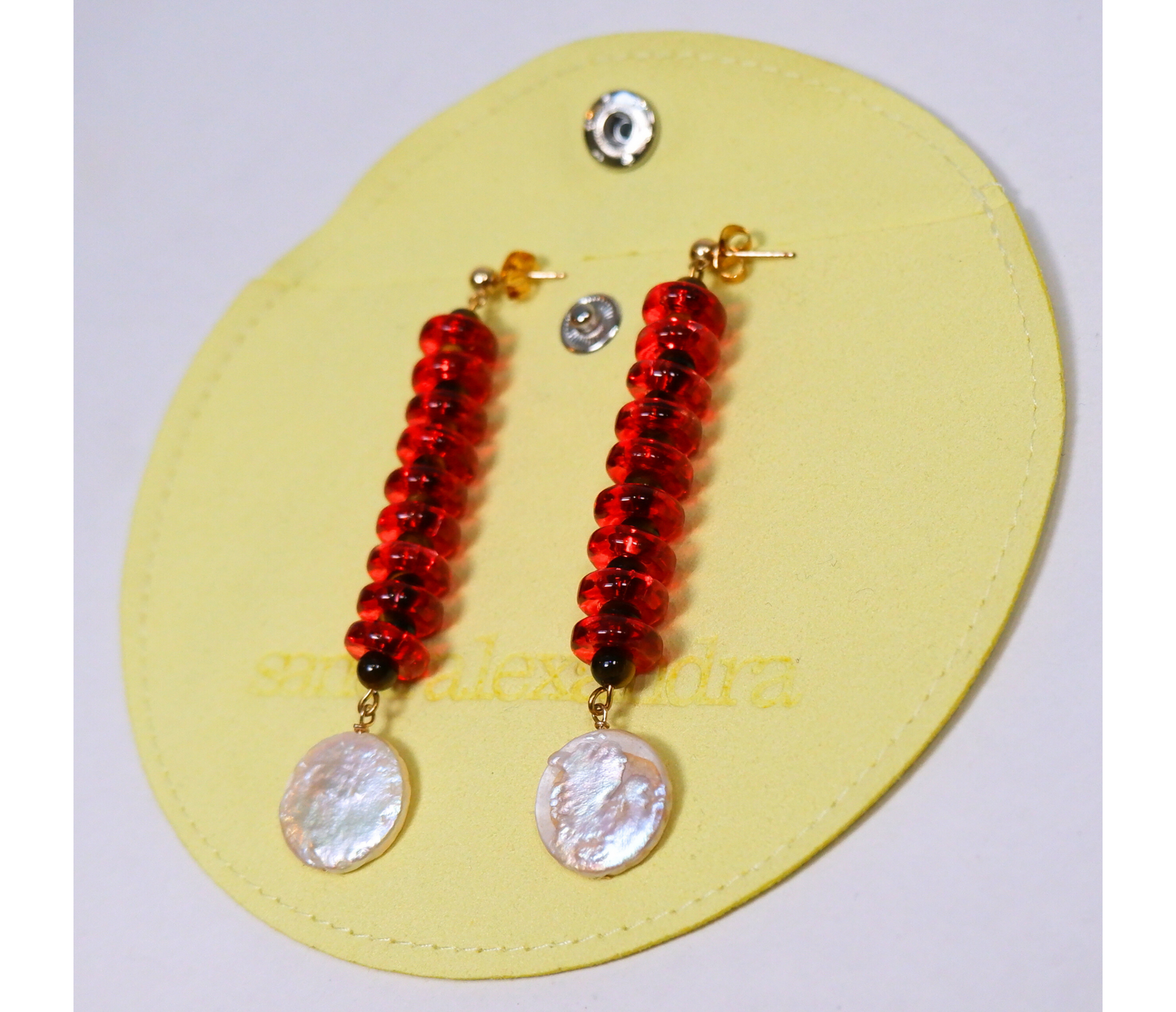 Alternating red glass rondelles and tiger eye semi precious stones create a rhythmic wave pattern that is finished with a distinctive keshi pearl. Finished with 14K gold filled earring findings.