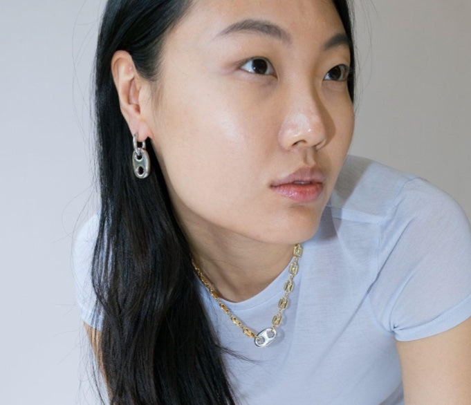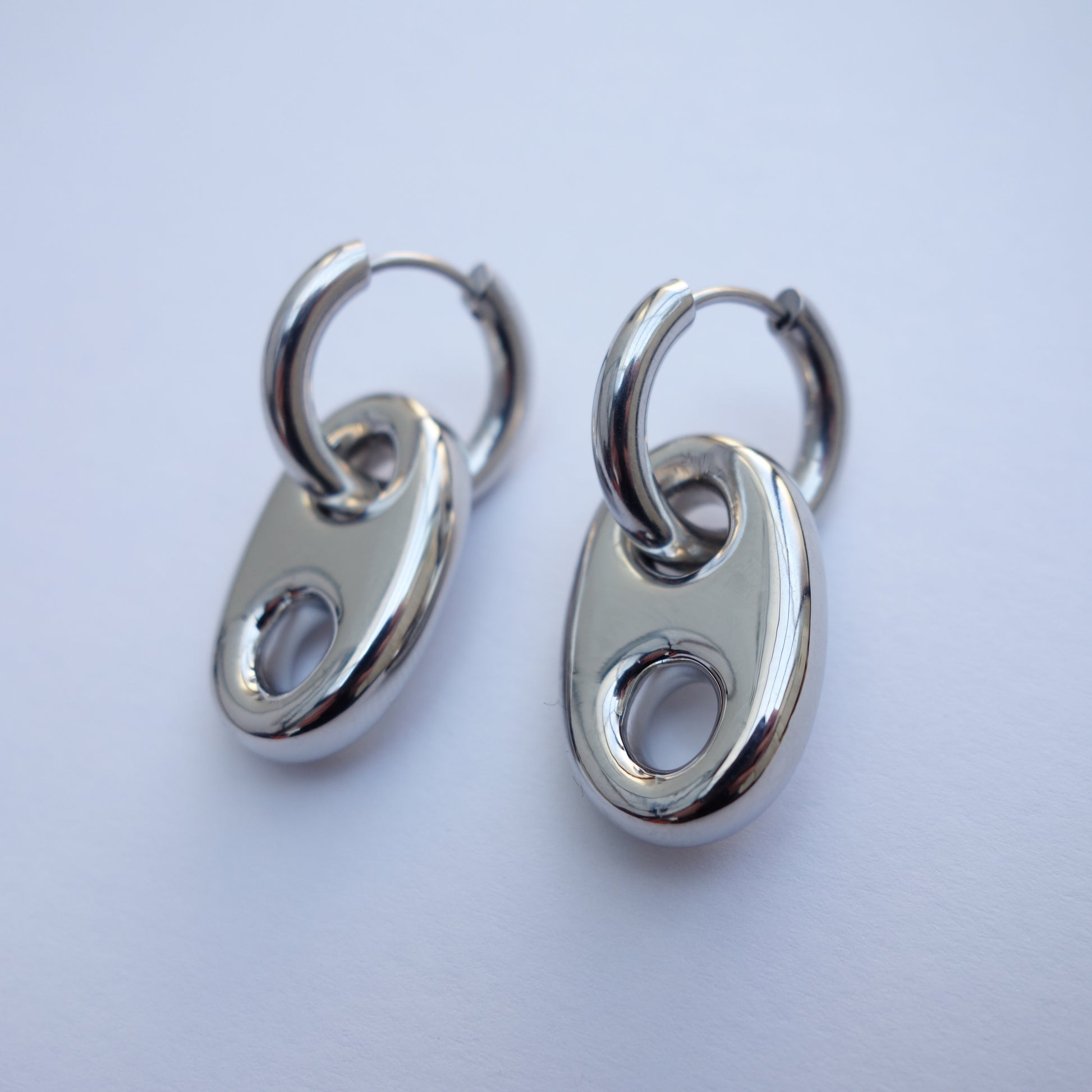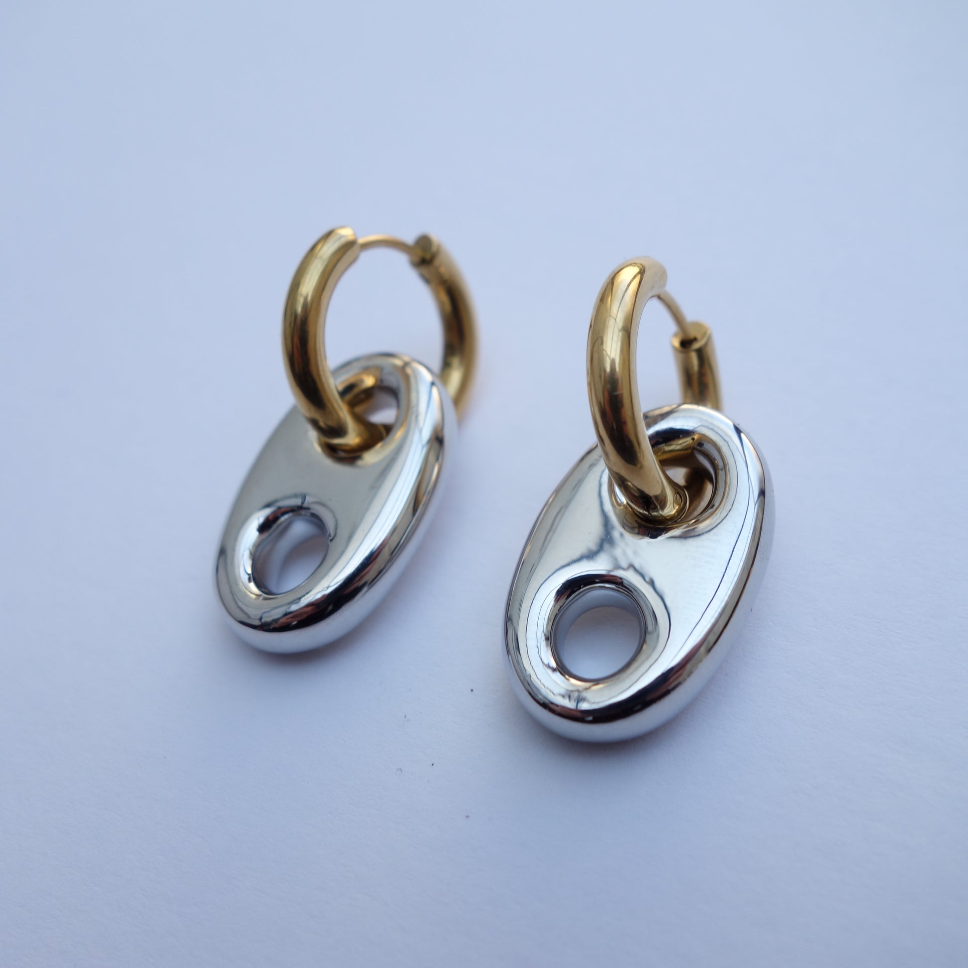 Hoops: 18K gold plated nickel free or Stainless steel with imitation rhodium plating. 3mm thick and 18mm outer diameter.
