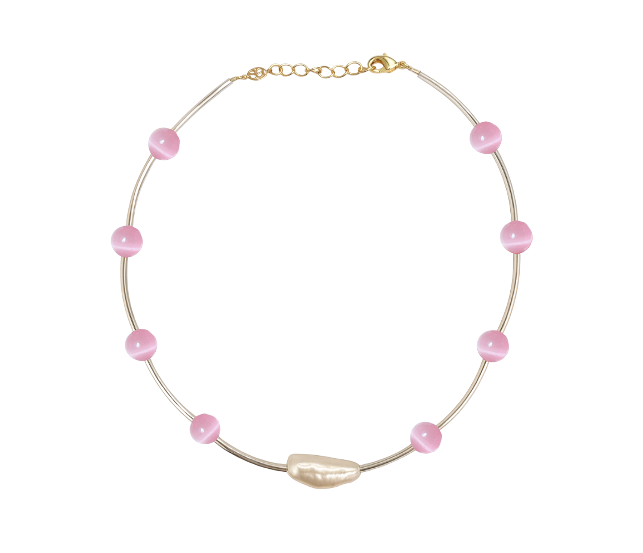 Silver 925 tubes with alternating Pink cat eye beads finished with a central keshi pearl. 18K gold plated clasp and extension chain.