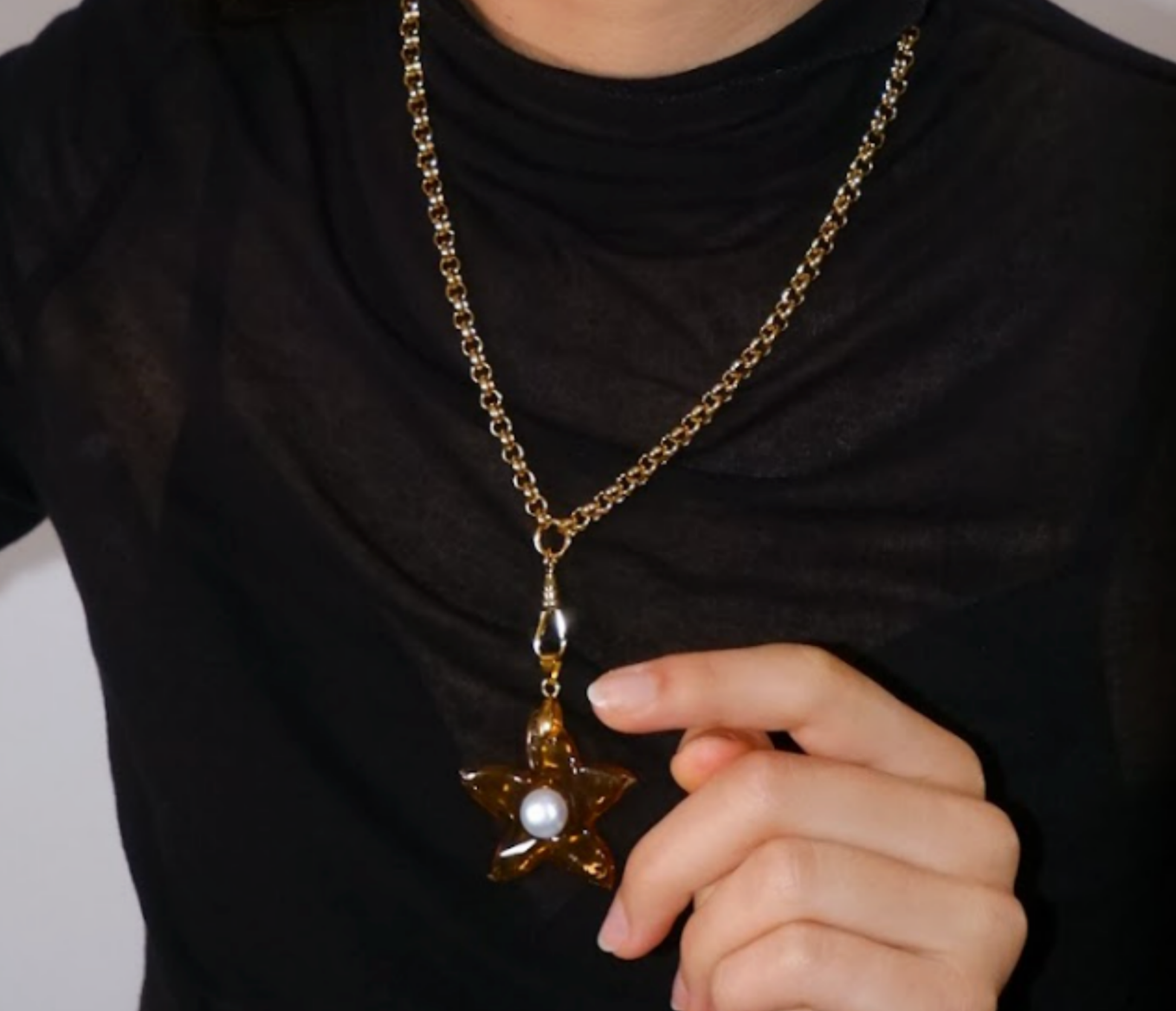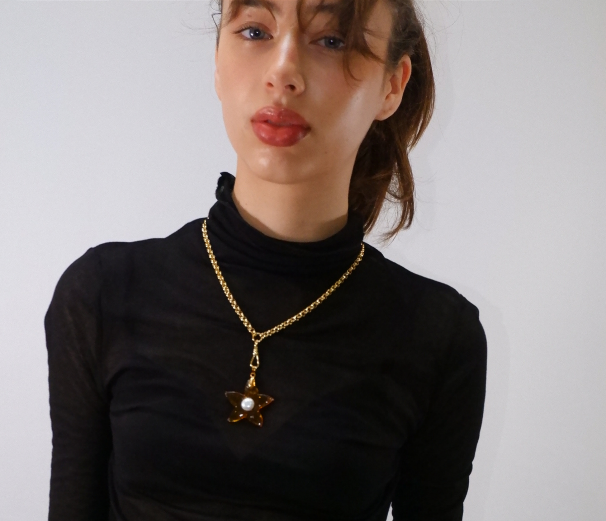Handcrafted Murano amber glass star charm set with a pearl centre, secured by an albert clasp and suspended from our signature 18K gold plated belcher chain.