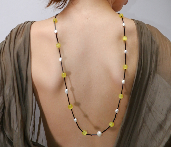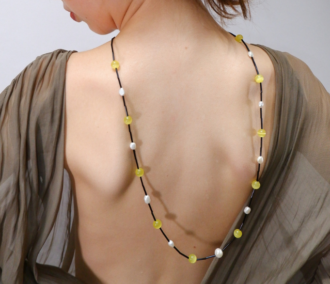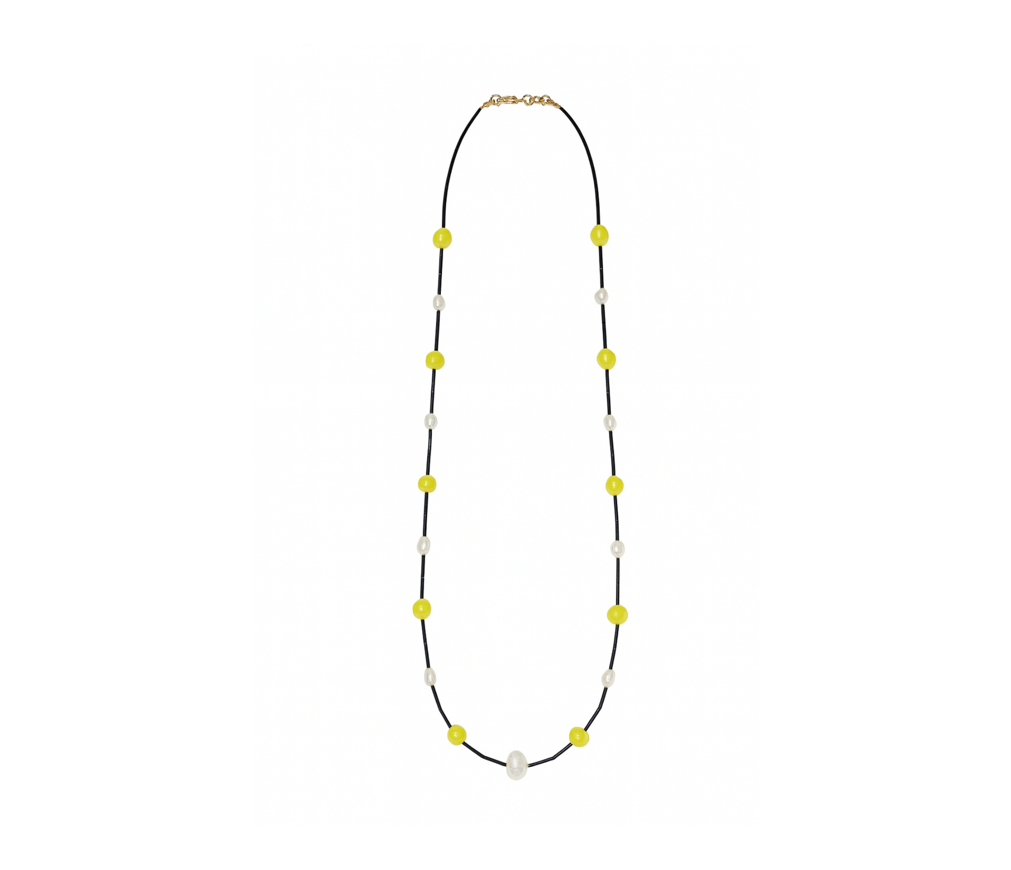 Black glass tubes with alternating citrine cat eye and pearl beads. 18K gold plated clasp and extension chain.