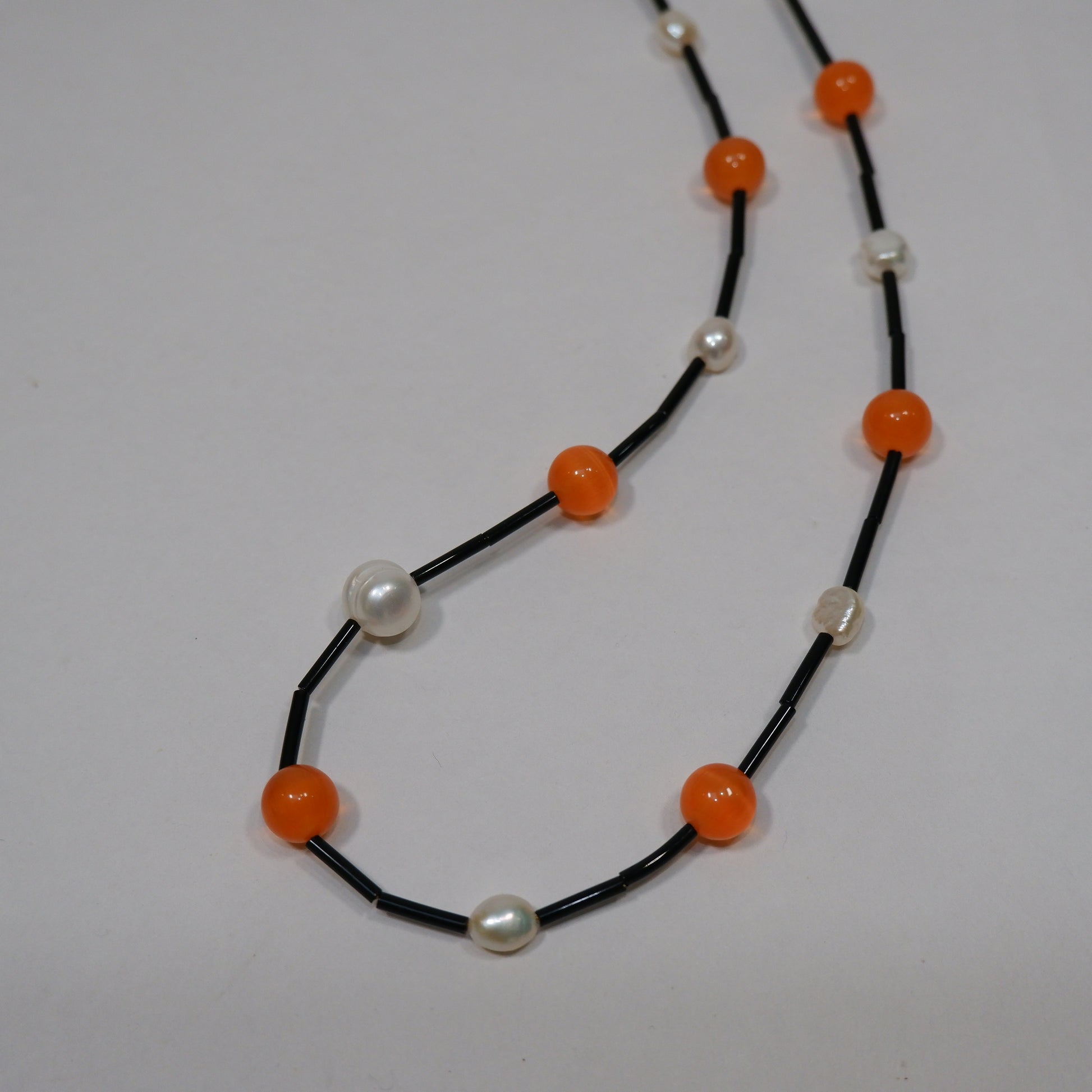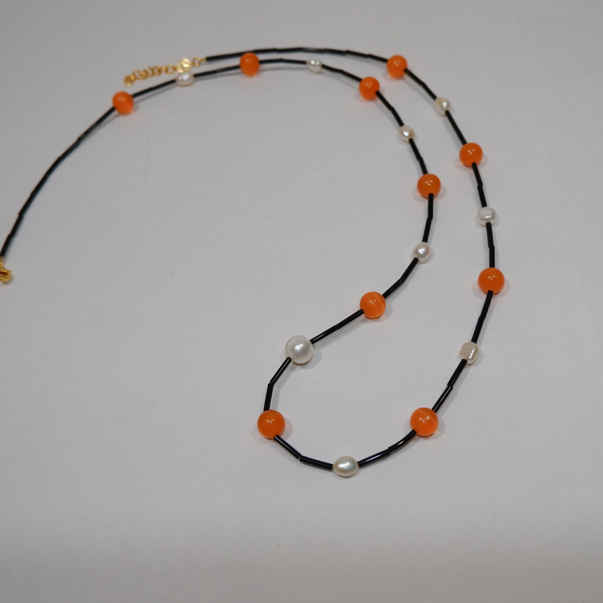 Black glass tubes with alternating orange cat eye and pearl beads. 18K gold plated clasp and extension chain.