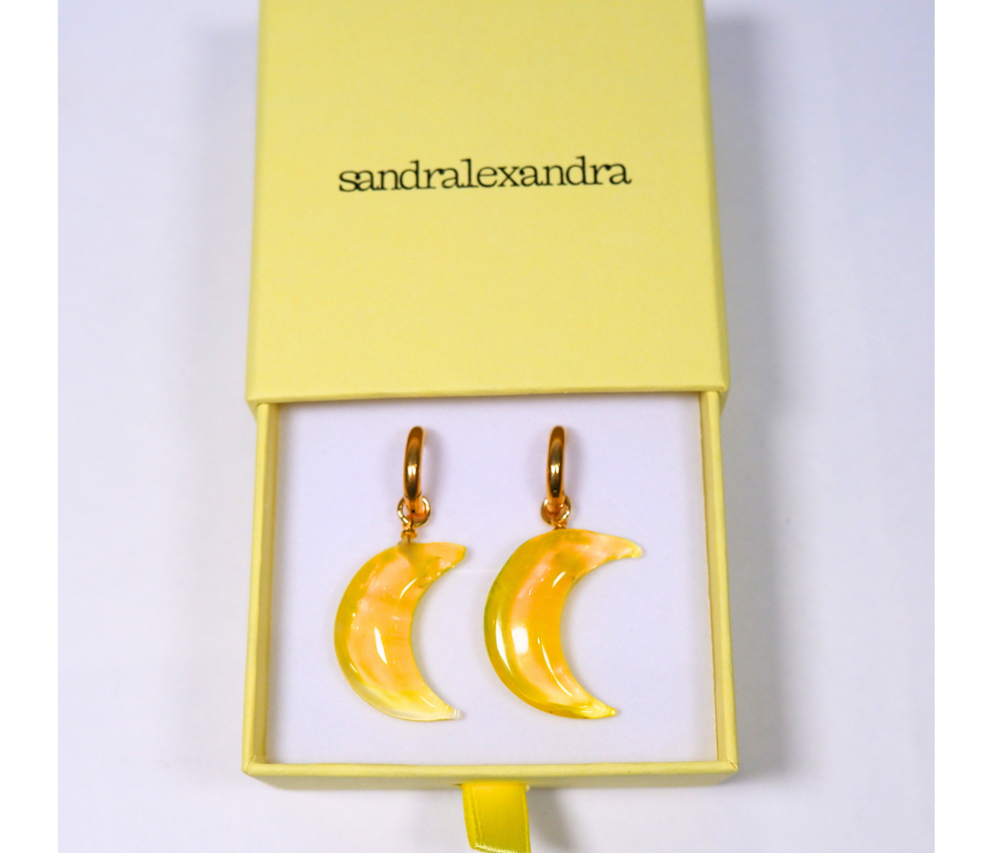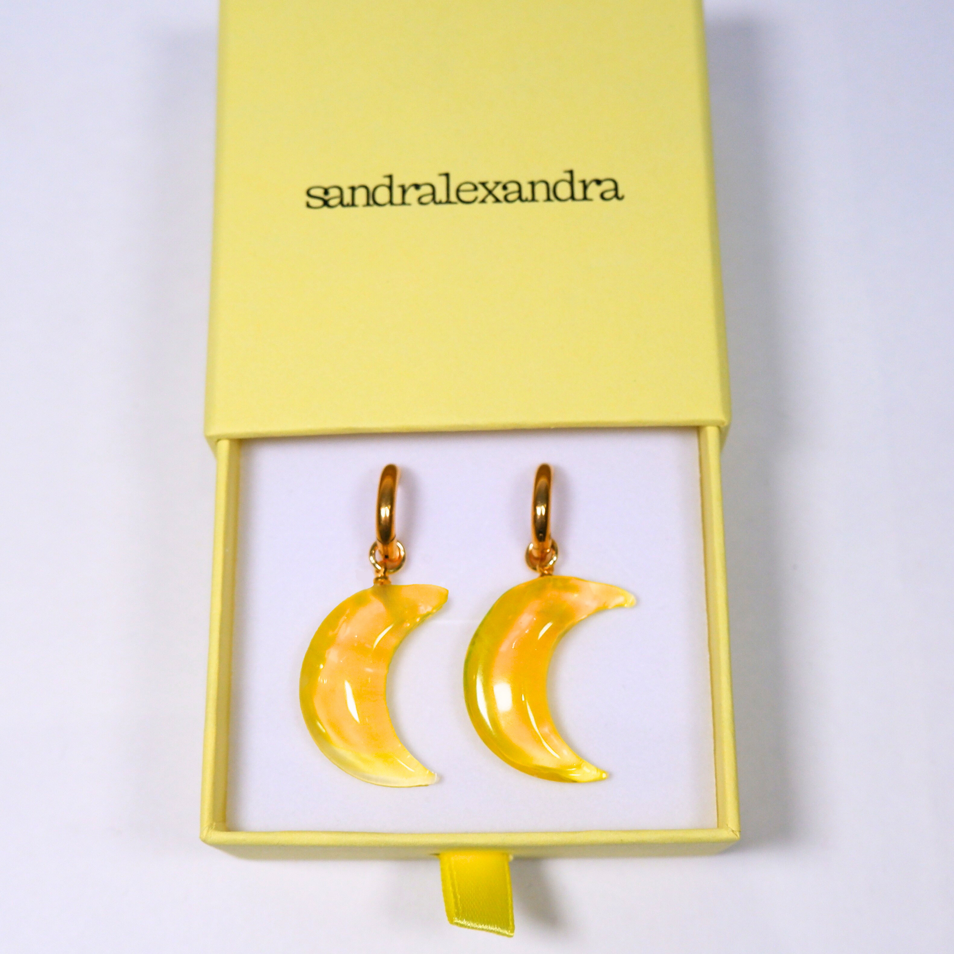 Handcrafted Murano lemon glass moon, suspended to a 18K gold plated nickel free hoop earring.