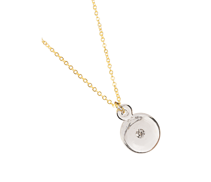 The Zirconite pendant has slight tool marks around the embedded zirconite and the loop attached to the chain, a natural result of the handmade production process